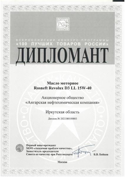 | Наименование | Назначение | Rosneft Revolux D3 LL 15W-40 | Предназначено для применения в высокомощных дизельных и бензиновых двигателях уровня ЕВРО-2, 3 и 4, в том числе оснащенных системой EGR, современных магистральных грузовиков, дорожно-строительной и карьерной техники, для которых рекомендованы масла эксплуатационного класса API CI-4/SL и ниже с увеличенным интервалом замены. СТО 44918199-113-2019 |